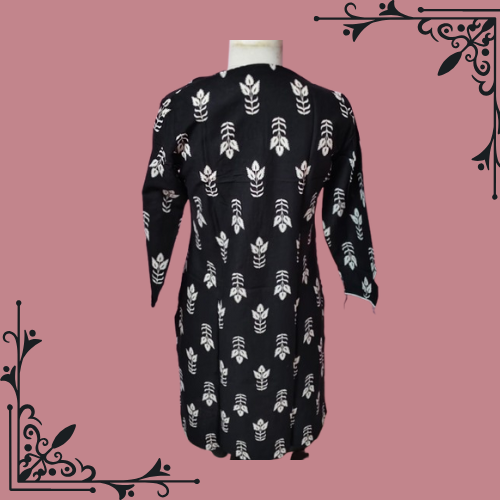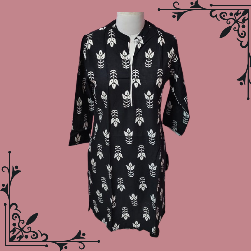 Elegant and versatile, this black kurti is perfect for every occasion. Made with cotton fabric, it features a modern cut and subtle detailing. Pair it with leggings, palazzos, or jeans for effortless style. A timeless wardrobe essential.